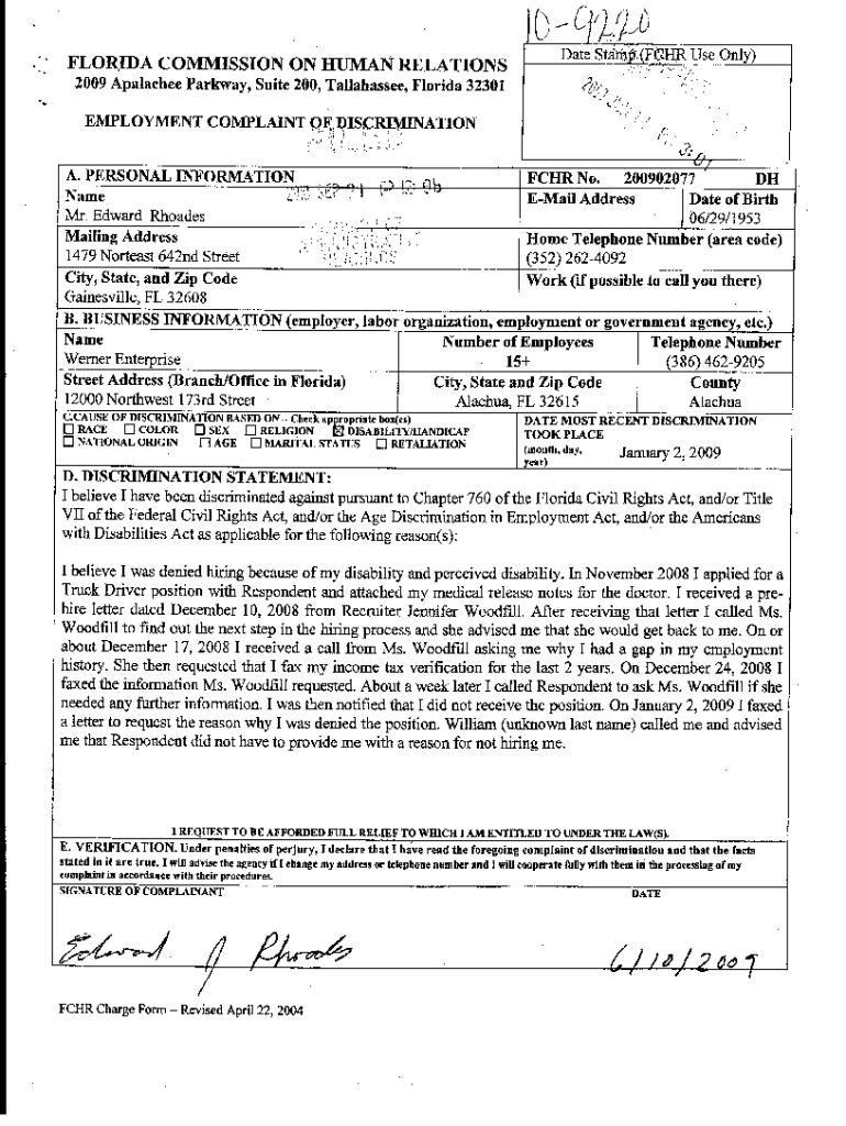 .;;D FLORIDA COMMISSION ON HUMAN RELATIONS.X\' ;EMPLOYMENT COMPLAINT OF DISCRIMINATIONMi I J 1VS:1//\'2009 Apalachee Parkway, Suite 200, Tallahassee, Florida 32301hDate Stamp (FGHR Use Only)/riXS7