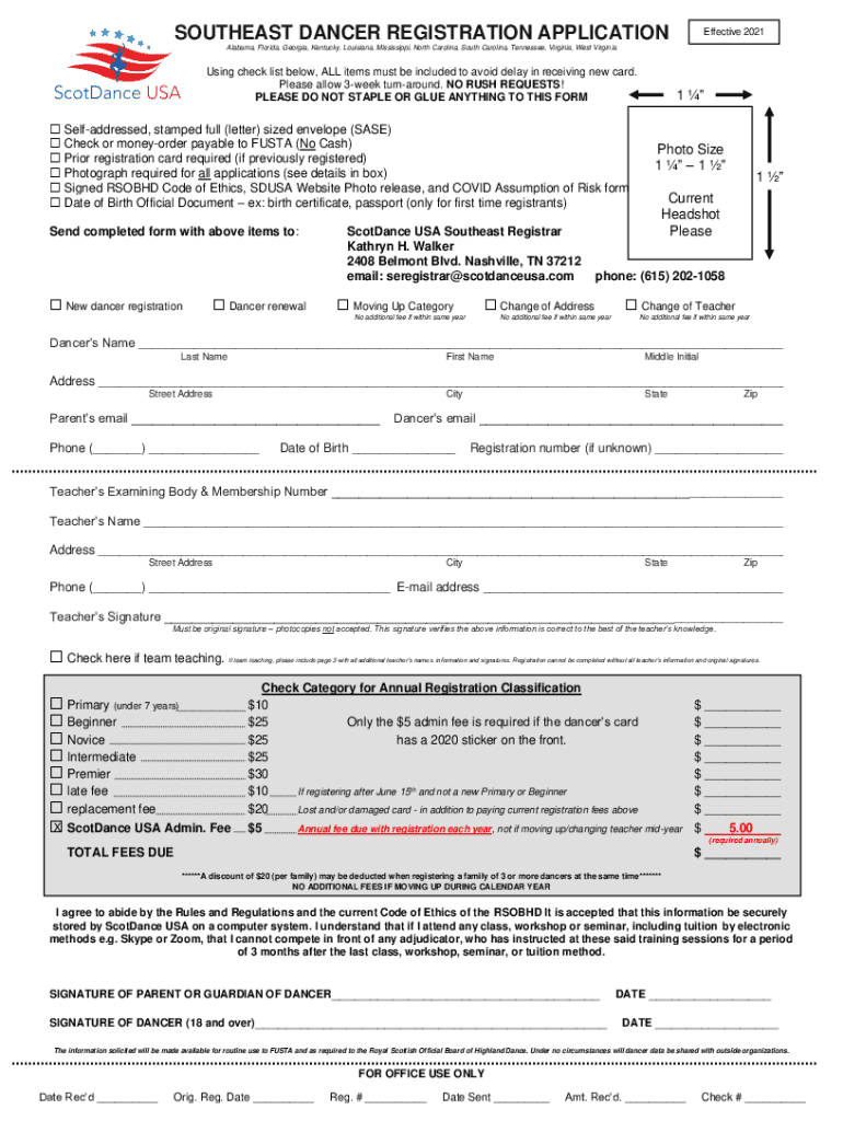 SOUTHEAST DANCER REGISTRATION APPLICATIONEffective 2021Alabama, Florida, Georgia, Kentucky, Louisiana, Mississippi, North Carolina, South Carolina, Tennessee, Virginia, West VirginiaUsing check list