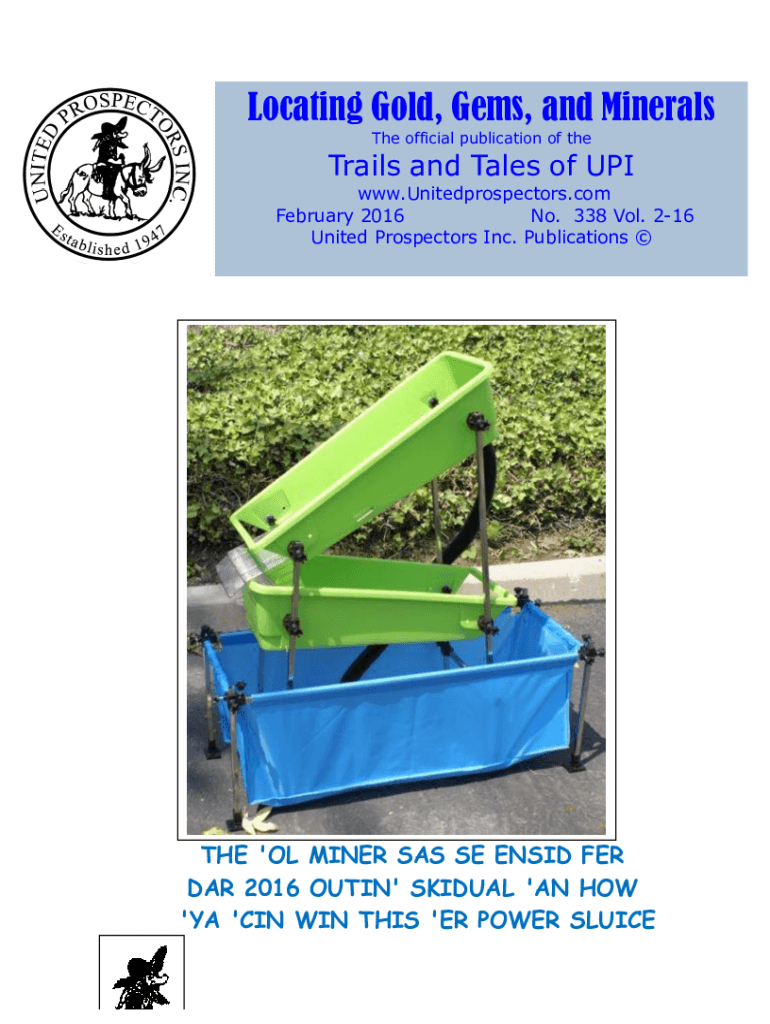 Locating Gold, Gems, and Minerals The official publication of theTrails and Tales of UPIwww.Unitedprospectors.com February 2016 No. 338 Vol. 216 United Prospectors Inc. Publications THE \'OL MINER