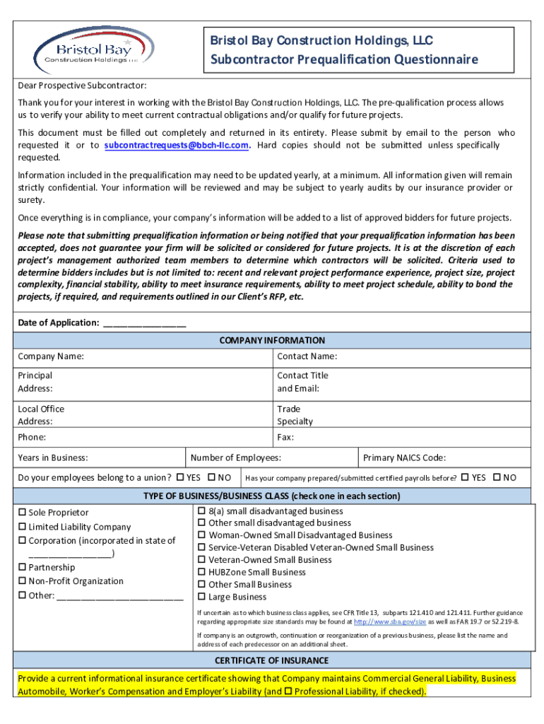 Subcontractor Prequalification Questionnaire
