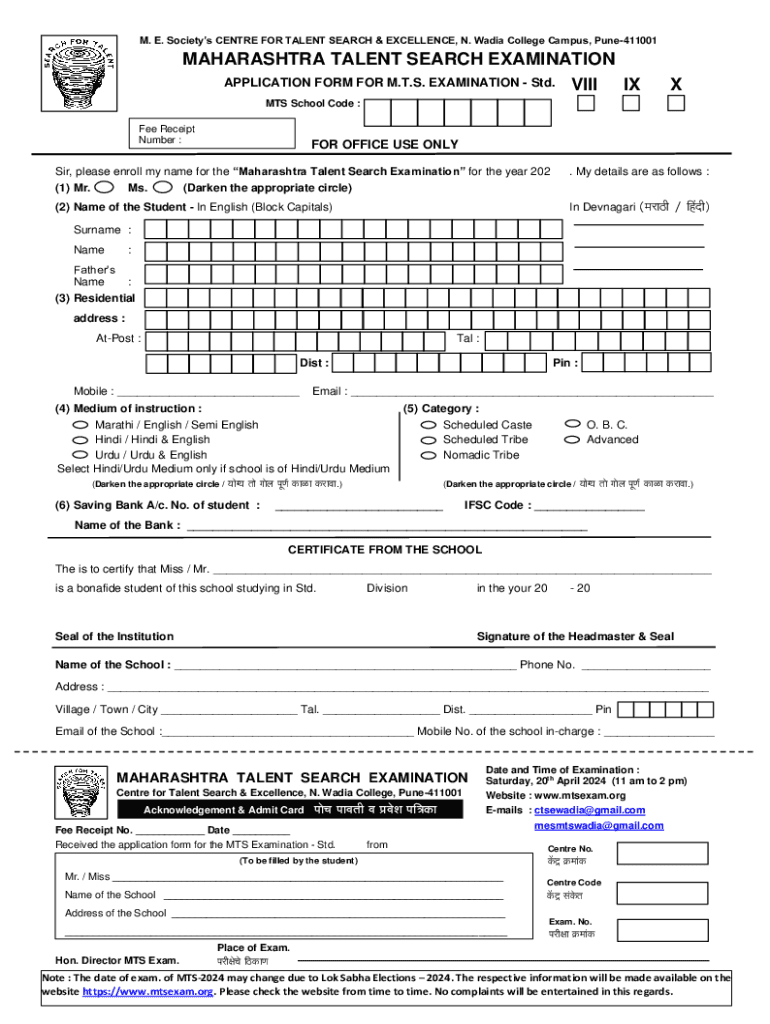 M. E. Societys CENTRE FOR TALENT SEARCH & EXCELLENCE, N. Wadia College Campus, Pune411001MAHARASHTRA TALENT SEARCH EXAMINATION APPLICATION FORM FOR M.T.S. EXAMINATION Std.VIIIIXXMTS School Code :