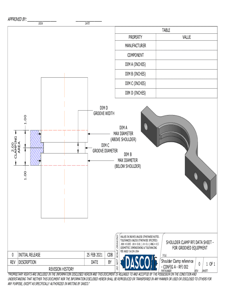 APPROVED BY: ___ SIGN___ DATETABLE VALUEPROPERTY MANUFACTURER COMPONENT DIM A (INCHES) DIM B (INCHES) DIM C (INCHES) DIM D (INCHES)1.00DIM D GROOVE WIDTH2.00 CLAMPING AREADIM A MAX DIAMETER (ABOVE