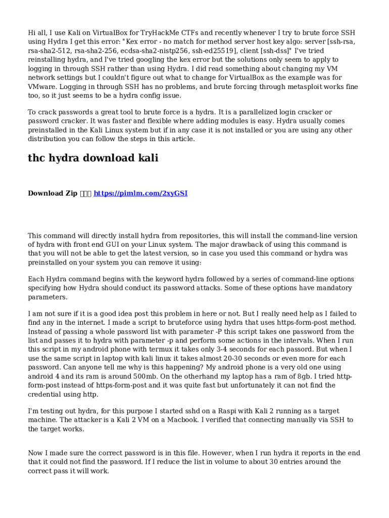 Hi all, I use Kali on VirtualBox for TryHackMe CTFs and recently whenever I try to brute force SSH using Hydra I get this error: \"Kex error no match for method server host key algo: server [sshrsa,