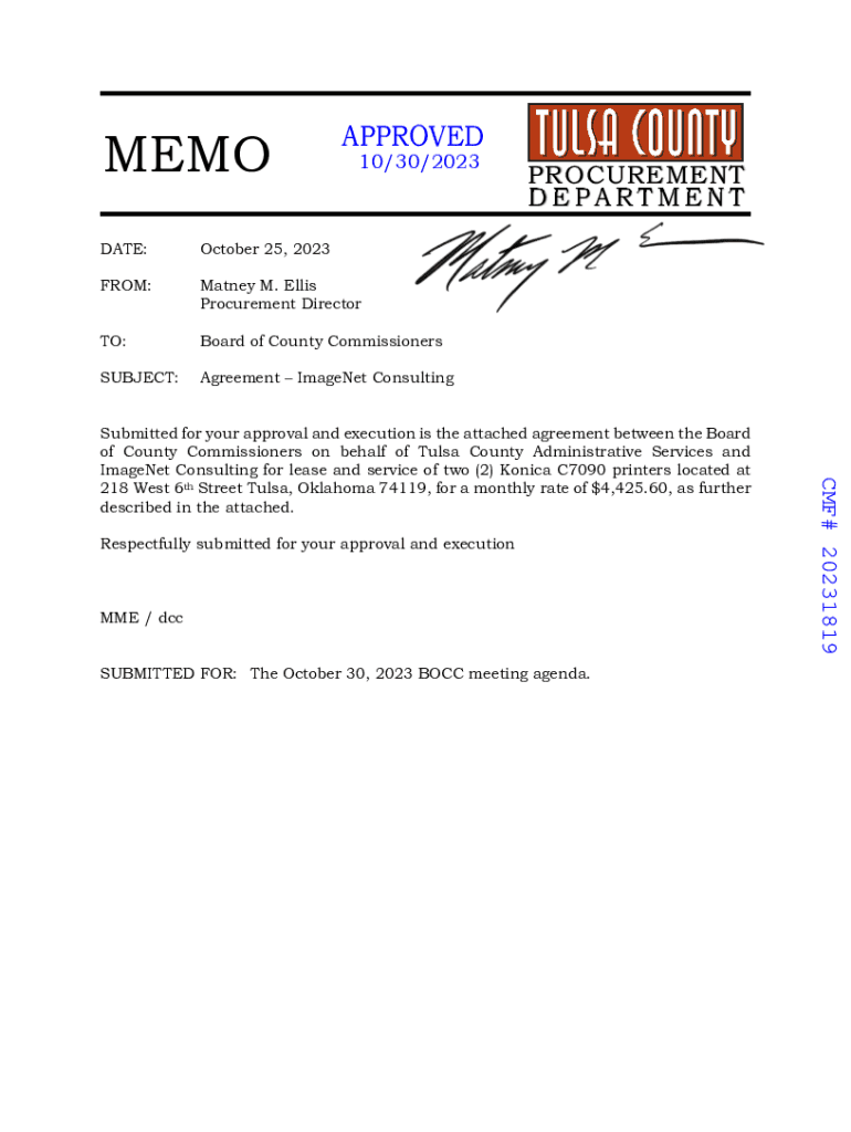 MEMOAPPROVED 10/30/2023DATE:October 25, 2023FROM:Matney M. Ellis Procurement DirectorTO:Board of County CommissionersSUBJECT:Agreement ImageNet ConsultingPROCUREMENT DEPARTMENTRespectfully submitted