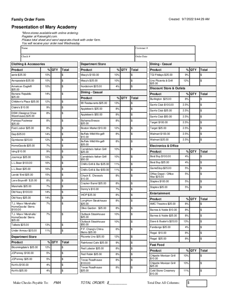 Created: 9/7/2022 9:44:29 AMFamily Order FormPresentation of Mary Academy *More stores available with online ordering. Register at Raiseright.com. PMA Code: E974174C16231 Please total sheet and send