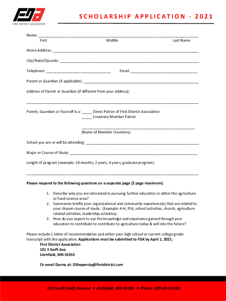 SCHOLARSHIP APPLICATION 2021 Name: ___ First Middle Last Name Home Address: ___ City/State/Zipcode: ___ Telephone: ___Email: ___Parent or Guardian (if applicable): ___ Address of Parent or Guardian