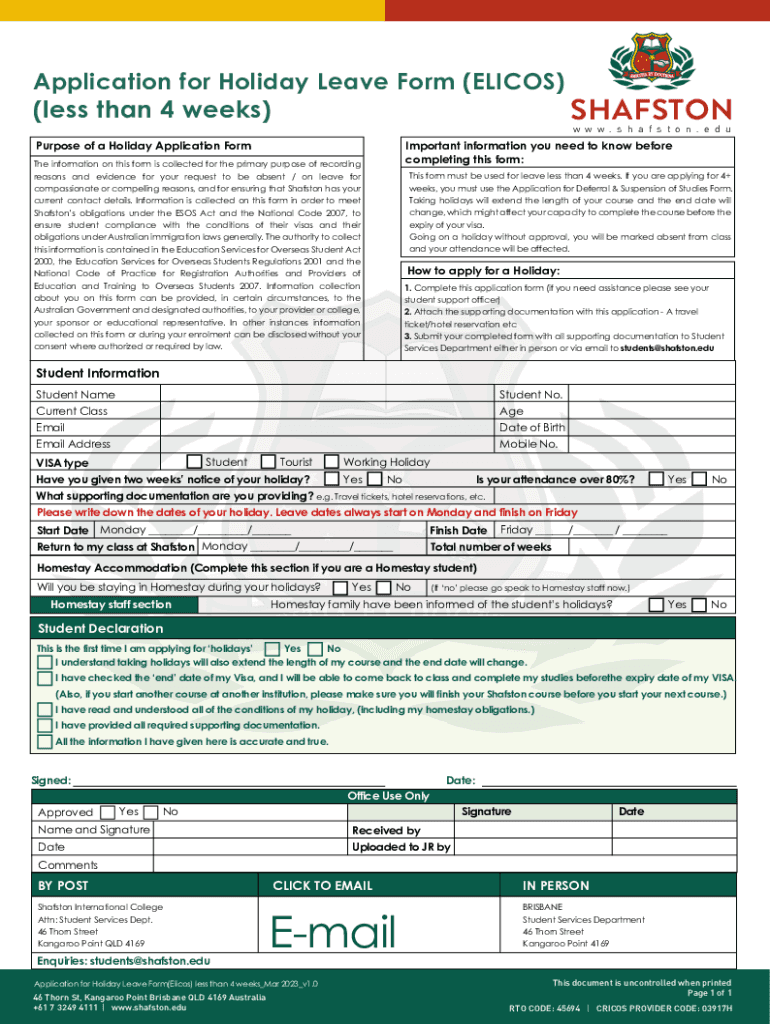 Application for Holiday Leave Form (ELICOS) (less than 4 weeks) SHAFSTON w w w . s h a f s t o n . e d uPurpose of a Holiday Application FormImportant information you need to know before completing
