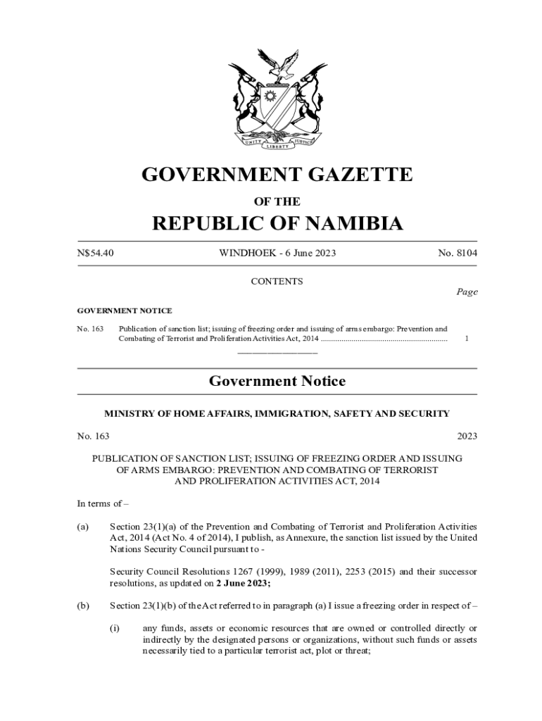 GOVERNMENT GAZETTE OF THEREPUBLIC OF NAMIBIA N$54.40WINDHOEK 6 June 2023No. 8104CONTENTSPageGOVERNMENT NOTICE Publication of sanction list; issuing of freezing order and issuing of arms embargo: Prevention