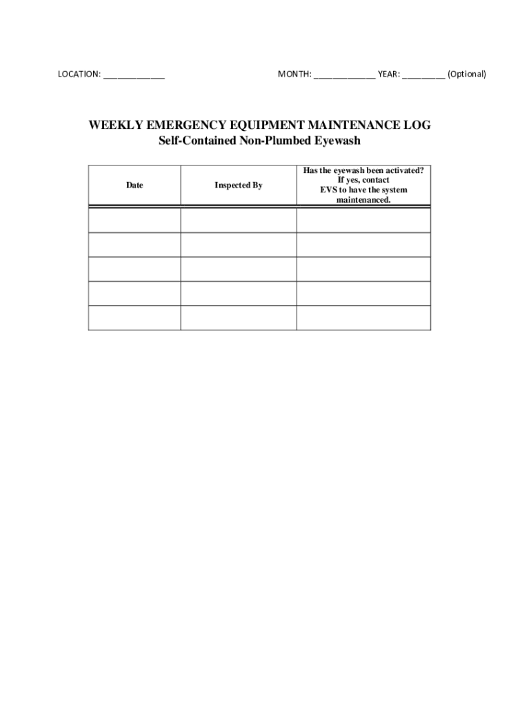 LOCATION: ___MONTH: ___ YEAR: ___ (Optional)WEEKLY EMERGENCY EQUIPMENT MAINTENANCE LOG SelfContained NonPlumbed EyewashDateInspected ByHas the eyewash been activated? If yes, contact EVS to have the