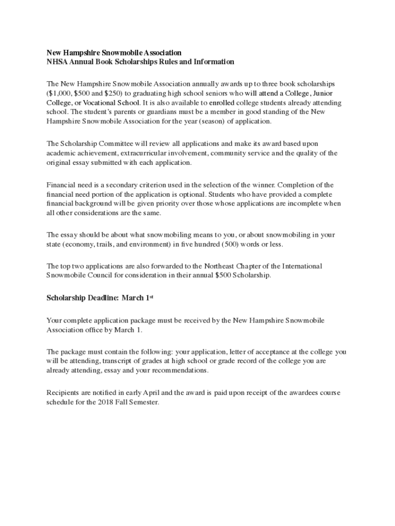 New Hampshire Snowmobile Association NHSA Annual Book ScholarshipsRules and Information The New Hampshire Snowmobile Association annually awards up to three book scholarships ($1,000, $500 and $250)