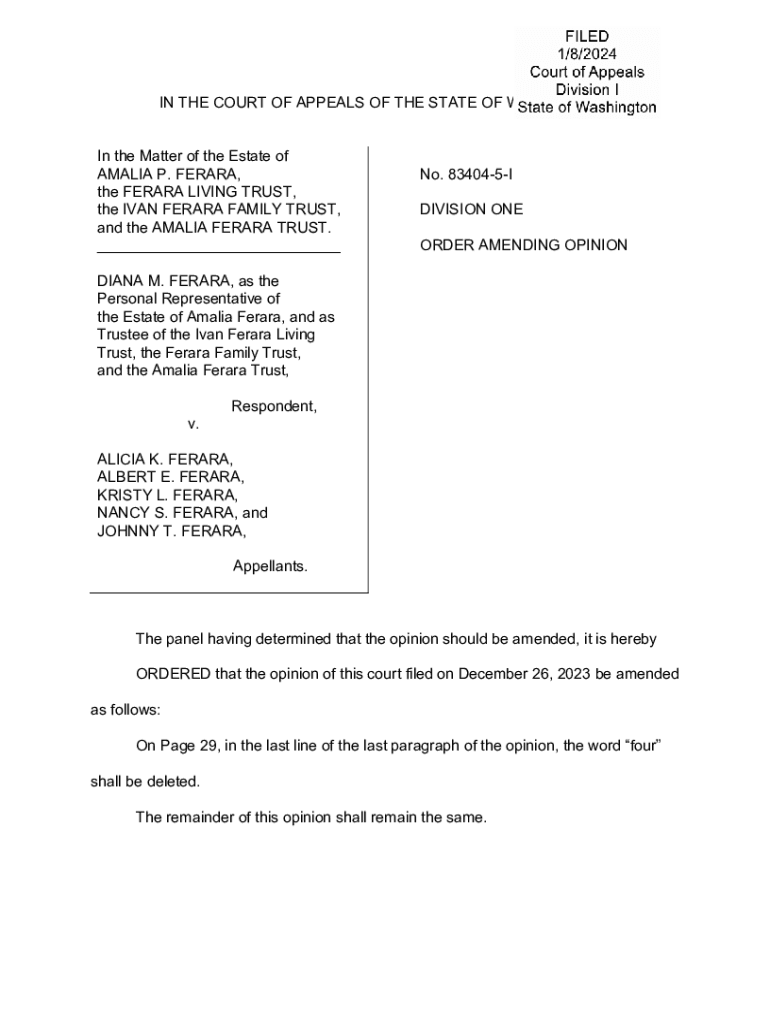 IN THE COURT OF APPEALS OF THE STATE OF WASHINGTON In the Matter of the Estate of AMALIA P. FERARA, the FERARA LIVING TRUST, the IVAN FERARA FAMILY TRUST, and the AMALIA FERARA TRUST. ___No. 834045I