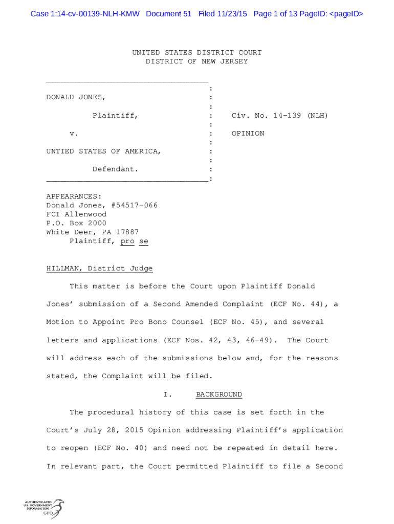 pdfFiller has an iOS app that lets you fill out documents on your phone. A subscription to the service means you can make an account or log in to one you already have. As soon as the registration process is done, upload your donald jones plaintiff. You can now use pdfFiller's more advanced features, like adding fillable fields and eSigning documents, as well as accessing them from any device, no matter where you are in the world.