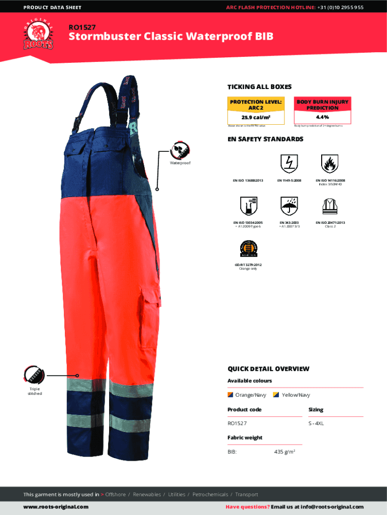 PRODUCT DATA SHEETARC FLASH PROTECTION HOTLINE: +31 (0)10 2955 955RO1527Stormbuster Classic Waterproof BIBTICKING ALL BOXES PROTECTION LEVEL: ARC 2BODY BURN INJURY PREDICTION 4.4%25.9 cal/m2 Above
