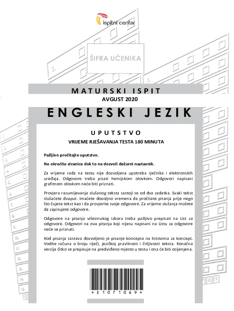 AVGUST 2020ENGLESKI JEZIK VRIJEME RJEAVANJA TESTA 180 MINUTA Paljivo proitajte uputstvo. Ne okreite stranice dok to ne dozvoli deurni nastavnik. Za vrijeme rada na testu nije dozvoljena upotreba rjenika