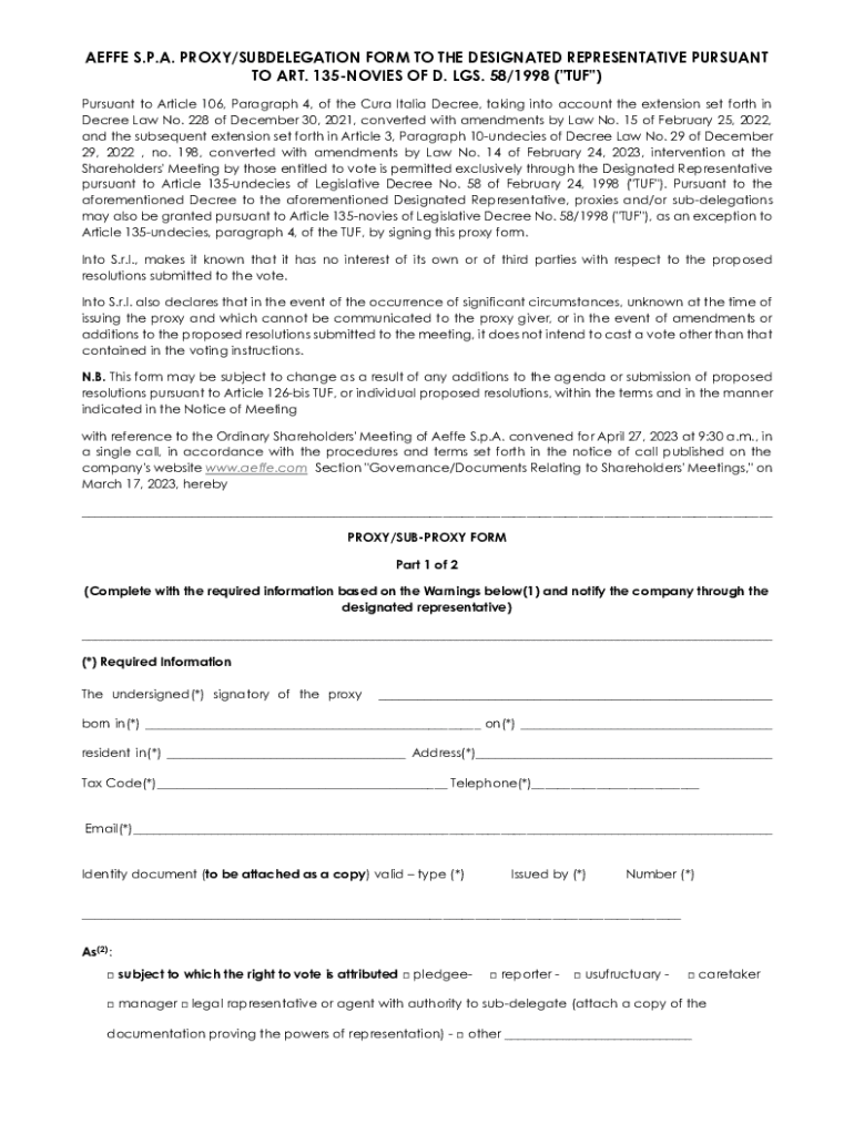AEFFE S.P.A. PROXY/SUBDELEGATION FORM TO THE DESIGNATED REPRESENTATIVE PURSUANT TO ART. 135NOVIES OF D. LGS. 58/1998 (\"TUF\") Pursuant to Article 106, Paragraph 4, of the Cura Italia Decree, taking