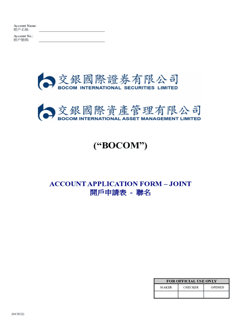 Account Name: : Account No.: :(BOCOM)ACCOUNT APPLICATION FORM JOINT FOR OFFICIAL USE ONLY MAKER(04/2022)CHECKEROPENEDACCOUNT APPLICATION FORM JOINT (Please as appropriate ) Joint Account Application