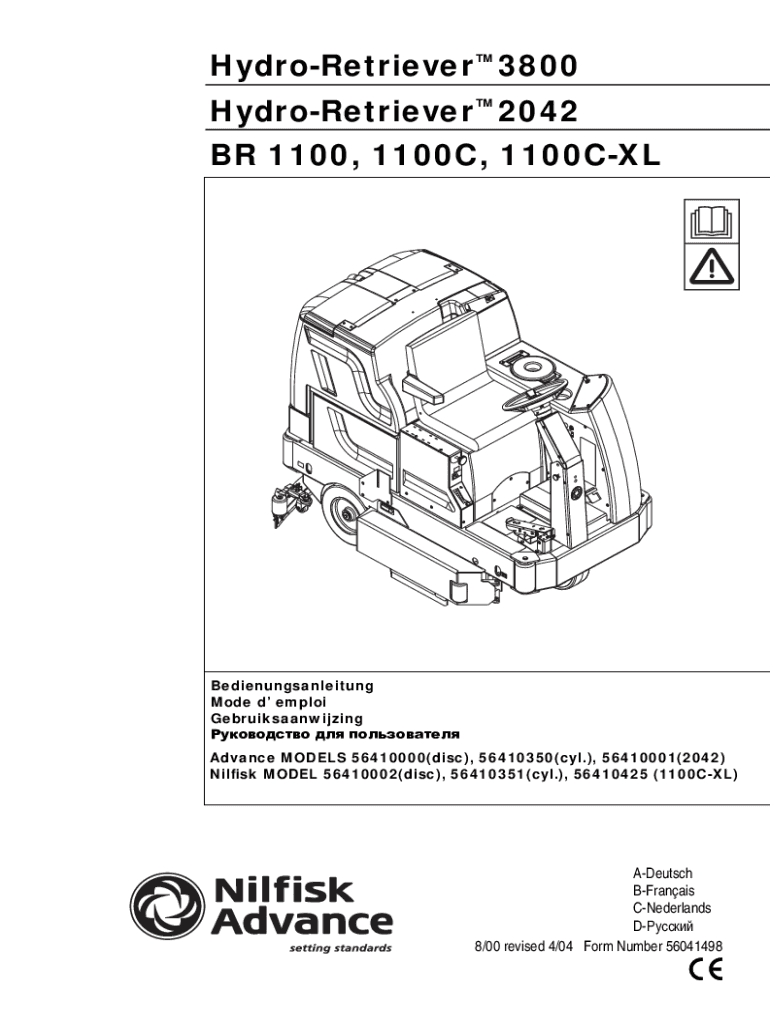 HydroRetriever 3800 HydroRetriever 2042 BR 1100, 1100C, 1100CXLBedienungsanleitung Mode d emploi Gebruiksaanwijzing Advance MODELS 56410000(disc), 56410350(cyl.), 56410001(2042) Nilfisk MODEL 56410002(disc),