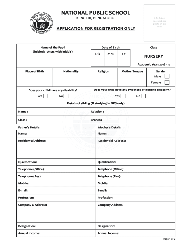 KENGERI, BENGALURU.OLNA TIONATIONAL PUBLIC SCHOOLUBLIC L P SC HONAAx latest passport size photo of the childAPPLICATION FOR REGISTRATION ONLYName of the Pupil (in block letters with initials)ClassDate
