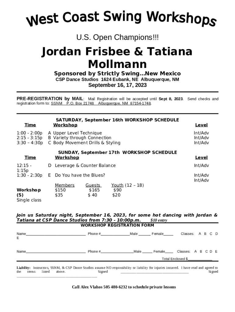 Once you're about filling out West Coast Swing Workshops Word template, ensure that you prepared all the required information. It's a mandatory part, as long as some typos may cause unwanted consequences starting with re-submission of the entire and filling out with deadlines missed and you might be charged a penalty fee. You should be really observative when writing down digits. At first sight, this task seems to be very simple. However, it's easy to make a mistake. Some people use such lifehack as storing all data in another document or a record book and then attach this into document's template. Nonetheless, come up with all efforts and provide accurate and correct info in West Coast Swing Workshops .doc form, and doublecheck it during the process of filling out all required fields. If it appears that some mistakes still persist, you can easily make corrections when you use PDFfiller editor and avoid blowing deadlines.