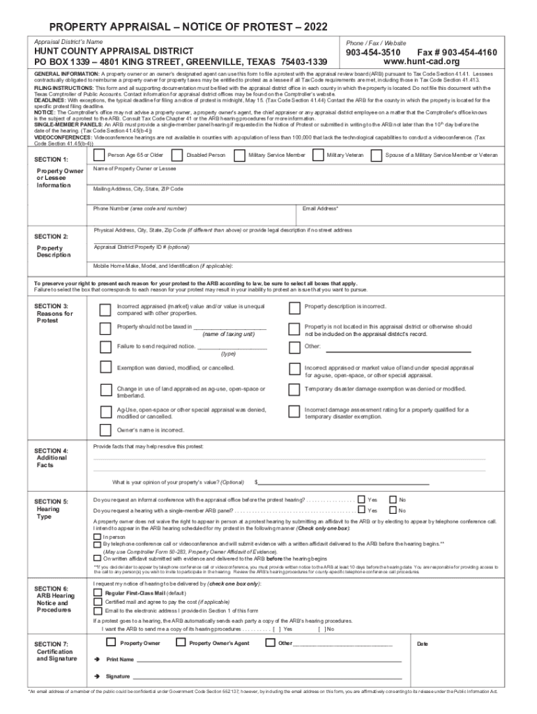 PROPERTY APPRAISAL NOTICE OF PROTEST 2022 Appraisal Districts NamePhone / Fax / WebsiteHUNT COUNTY APPRAISAL DISTRICT PO BOX 1339 4801 KING STREET, GREENVILLE, TEXAS 7540313399034543510 Fax # 9034544160