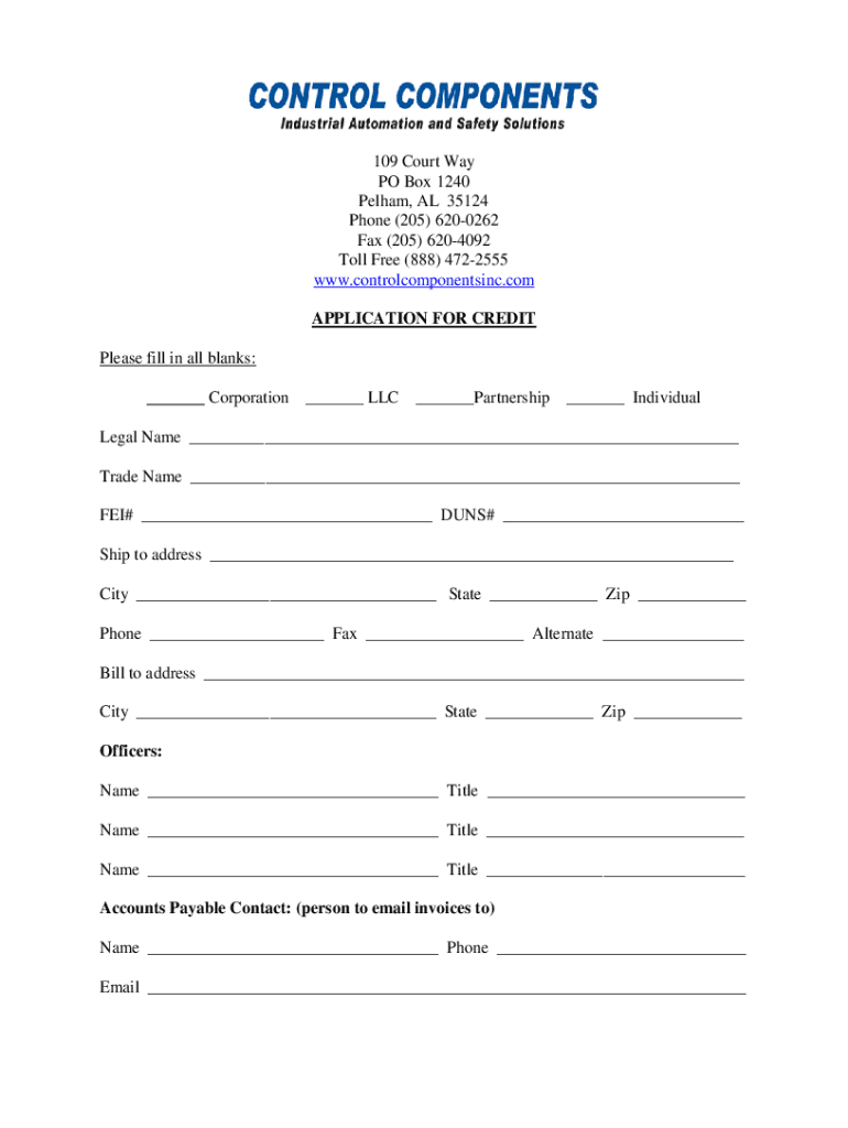 109 Court Way PO Box 1240 Pelham, AL 35124 Phone (205) 6200262 Fax (205) 6204092 Toll Free (888) 4722555 www.controlcomponentsinc.com APPLICATION FOR CREDIT Please fill in all blanks: ___ Corporation___