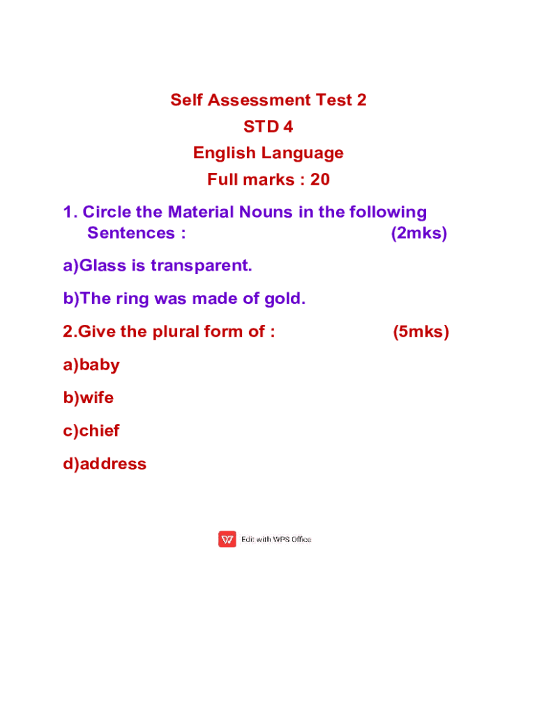 Self Assessment Test 2 STD 4 English Language Full marks : 20 1. Circle the Material Nouns in the following Sentences : (2mks) a)Glass is transparent. b)The ring was made of gold. 2.Give the plural