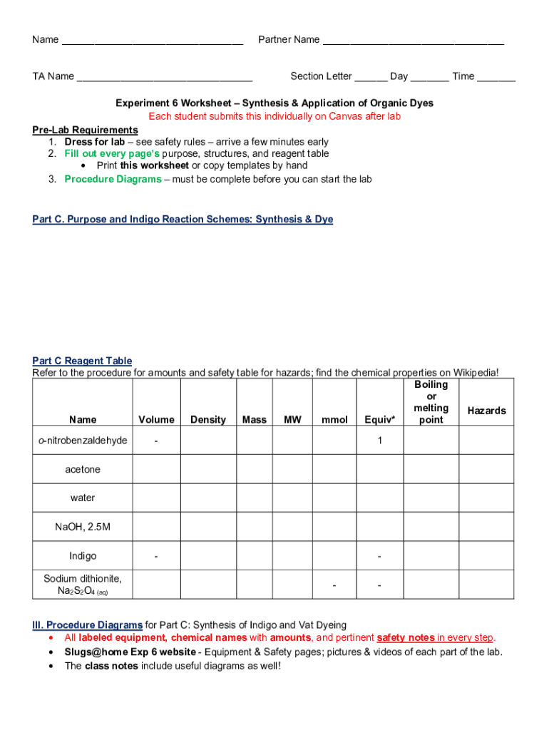 Name ___ TA Name ___Partner Name ___ Section Letter ___ Day ___ Time ___Experiment 6 Worksheet Synthesis & Application of Organic Dyes Each student submits this individually on Canvas after lab PreLab