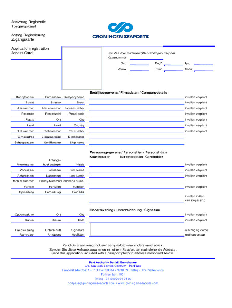 Aanvraag Registratie Toegangskaart Antrag Registrierung Zugangskarte Application registration Access CardInvullen door medewerk(st)er GroningenSeaports KaartnummerFoto hier Photo hereOutlBegBIproVoorwFconScanBedrijfsgegevens