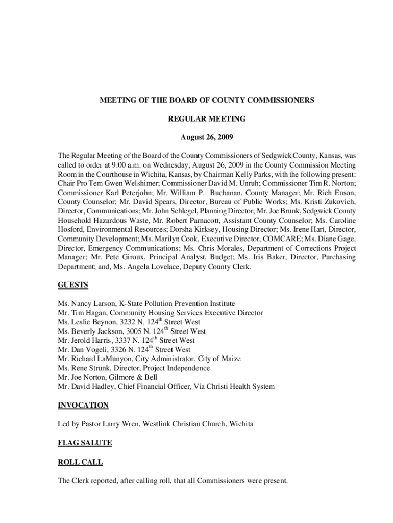 MEETING OF THE BOARD OF COUNTY COMMISSIONERS REGULAR MEETING August 26, 2009 The Regular Meeting of the Board of the County Commissioners of Sedgwick County, Kansas, was called to order at 9:00 a.m.