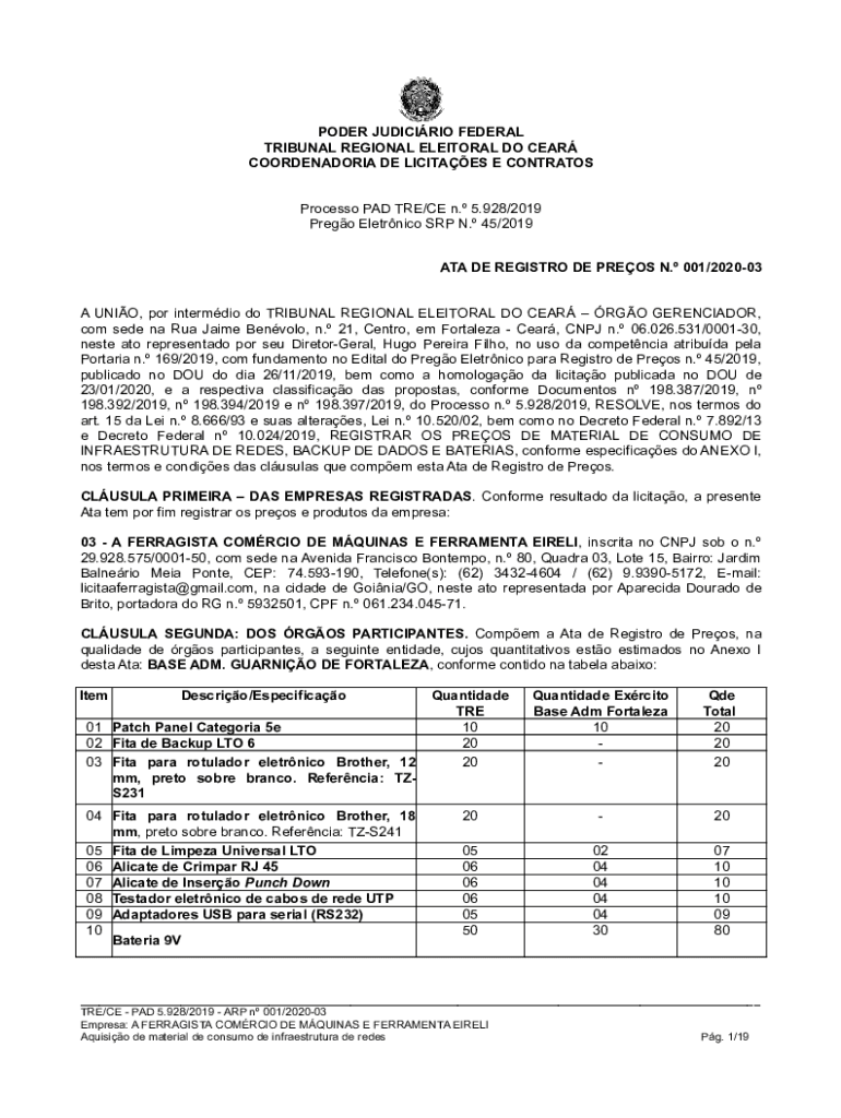 PODER JUDICIRIO FEDERAL TRIBUNAL REGIONAL ELEITORAL DO CEAR COORDENADORIA DE LICITAES E CONTRATOS Processo PAD TRE/CE n. 5.928/2019 Prego Eletrnico SRP N. 45/2019 ATA DE REGISTRO DE PREOS N. 001/202003