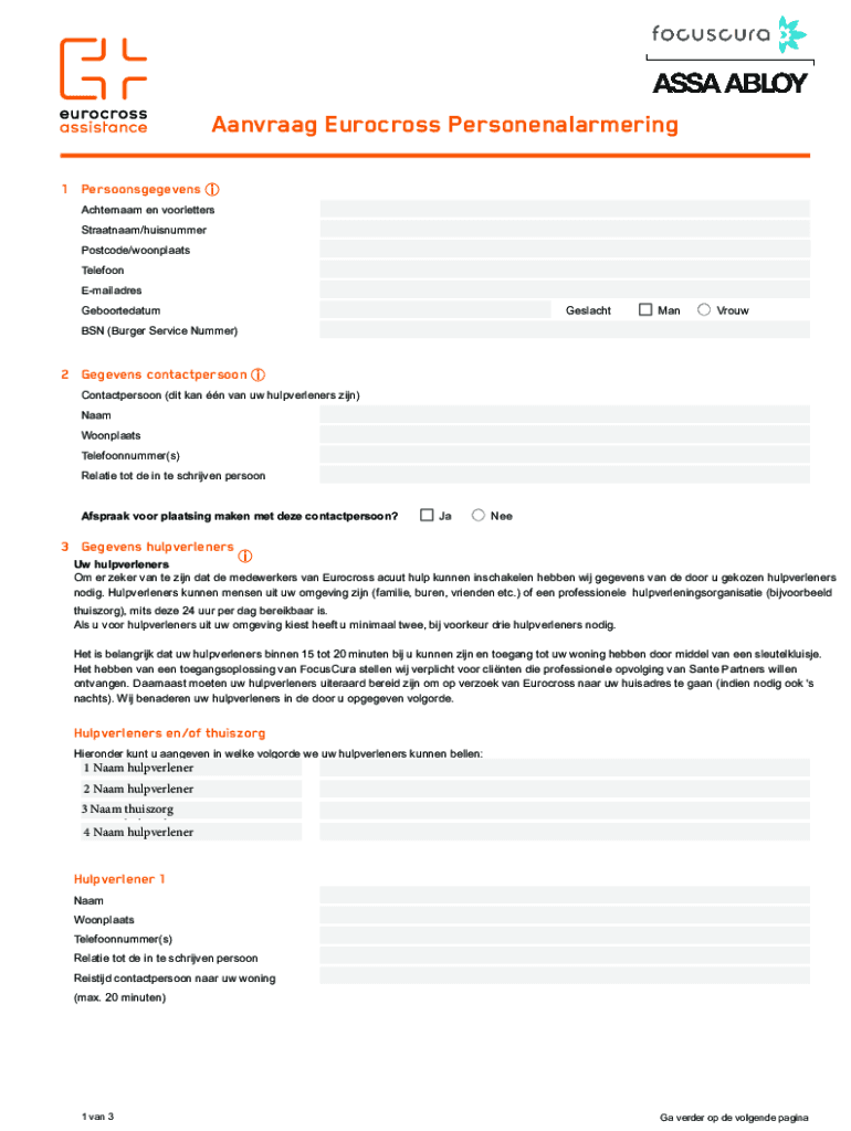 Aanvraag Eurocross Personenalarmering 1 Persoonsgegevens Achternaam en voorlettersStraatnaam/huisnummer Postcode/woonplaats Telefoon Emailadres GeboortedatumManGeslachtVrouwBSN (Burger Service Nummer)2Gegevens