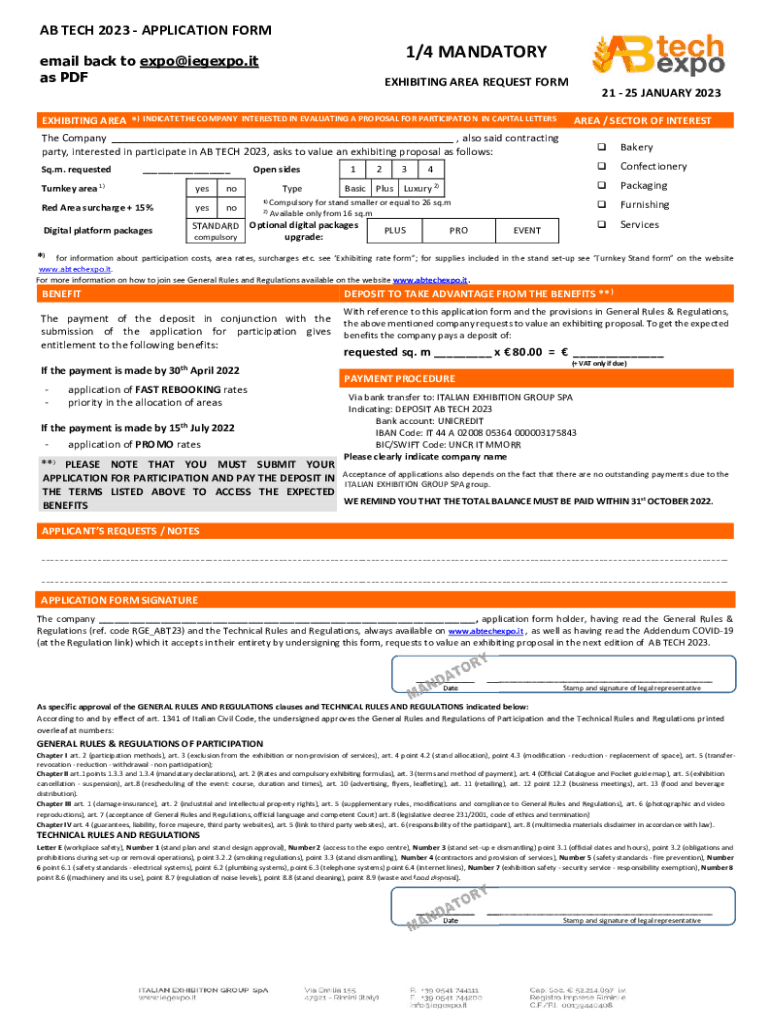 ABTECH2023APPLICATIONFORM1/4MANDATORYemail back to expo@iegexpo.it as PDFEXHIBITINGAREAREQUESTFORM2125JANUARY2023EXHIBITINGAREA*)INDICATETHECOMPANYINTERESTEDINEVALUATINGAPROPOSALFORPARTICIPATIONINCAPITALLETTERSAREA/SECTOROFINTERESTTheCompany___,alsosaidcontracting