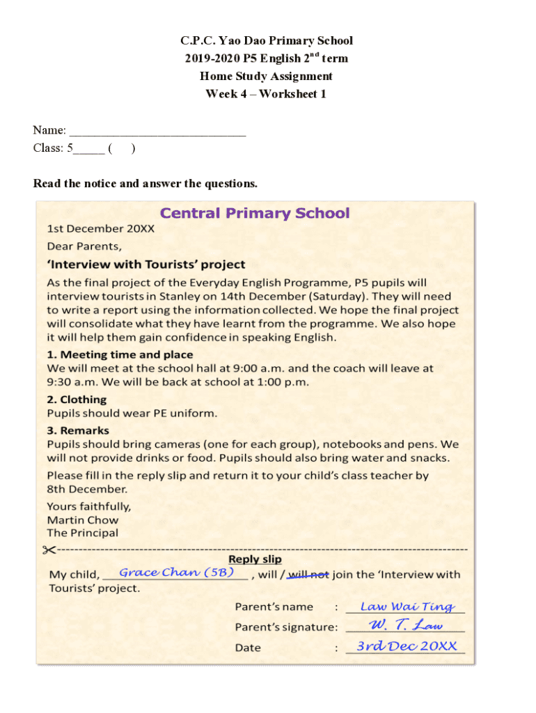 C.P.C. Yao Dao Primary School 20192020 P5 English 2nd term Home Study Assignment Week 4 Worksheet 1 Name: ___ Class: 5___ ()Read the notice and answer the questions.Read the notice carefully. Choose