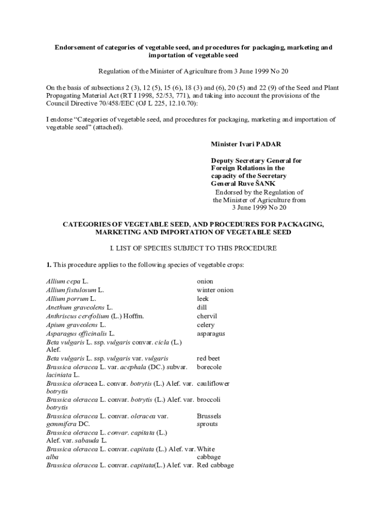 Endorsement of categories of vegetable seed, and procedures for packaging, marketing and importation of vegetable seed Regulation of the Minister of Agriculture from 3 June 1999 No 20 On the basis