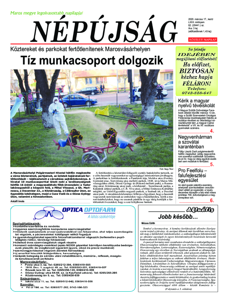 2020. mrcius 17., kedd LXXII. vfolyam 62. (20441.) sz. ra: 3 lej (elfizetknek 1,43 lej)Tz munkacsoport dolgozikKztereket s parkokat ferttlentenek MarosvsrhelyenKrik a magyar nyelv tviskoltA Magyar