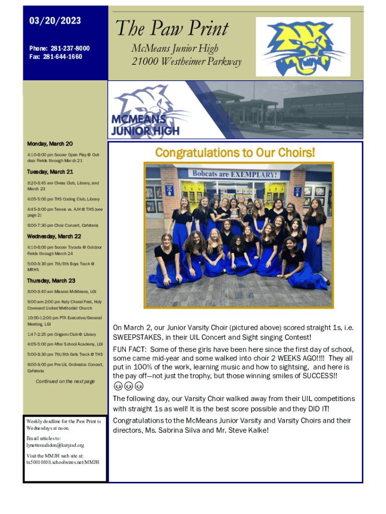 03/20/2023 Phone: 2812378000 Fax: 2816441660Monday, March 20 4:106:00 pm Soccer Open Play @ Outdoor Fields through March 21The Paw PrintMcMeans Junior High 21000 Westheimer ParkwayCongratulations