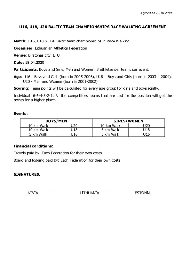 Agreed on 25.10.2019U16, U18, U20 BALTIC TEAM CHAMPIONSHIPS RACE WALKING AGREEMENT Match: U16, U18 & U20 Baltic team championships in Race Walking Organiser: Lithuanian Athletics Federation Venue:
