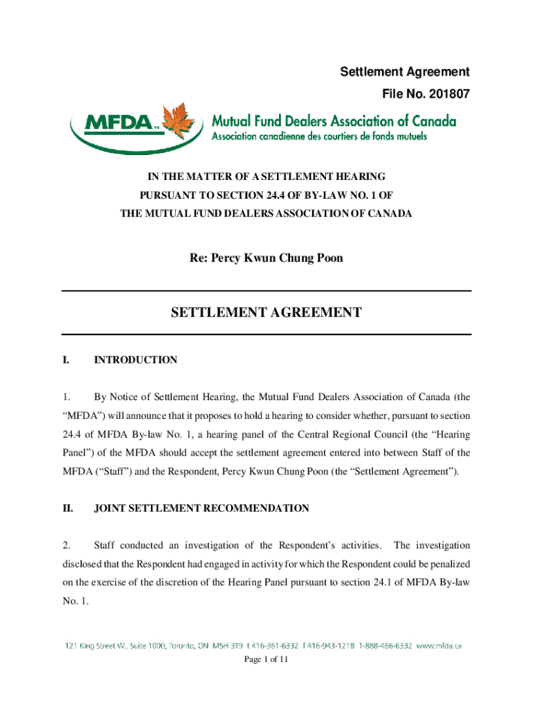 Settlement Agreement File No. 201807IN THE MATTER OF A SETTLEMENT HEARING PURSUANT TO SECTION 24.4 OF BYLAW NO. 1 OF THE MUTUAL FUND DEALERS ASSOCIATION OF CANADARe: Percy Kwun Chung PoonSETTLEMENT