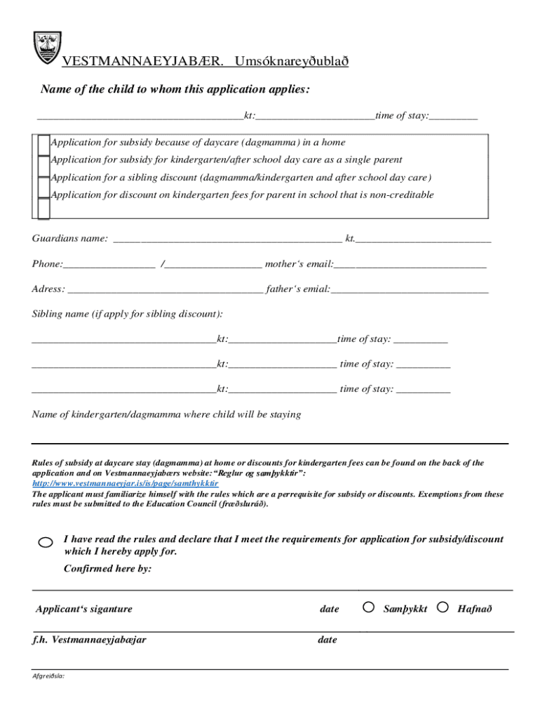 VESTMANNAEYJABR. Umsknareyubla Name of the child to whom this application applies: ___kt:___time of stay:___ Application for subsidy because of daycare (dagmamma) in a home Application for subsidy