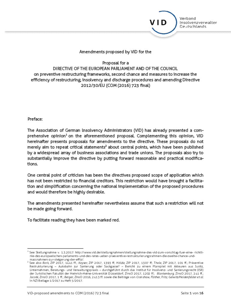 Amendments proposed by VID for the Proposal for a DIRECTIVE OF THE EUROPEAN PARLIAMENT AND OF THE COUNCIL on preventive restructuring frameworks, second chance and measures to increase the efficiency