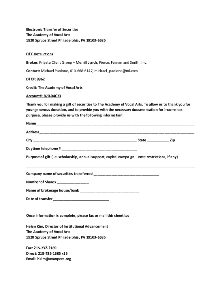 Electronic Transfer of Securities The Academy of Vocal Arts 1920 Spruce Street Philadelphia, PA 191036685 DTC Instructions Broker: Private Client Group Merrill Lynch, Pierce, Fenner and Smith, Inc.