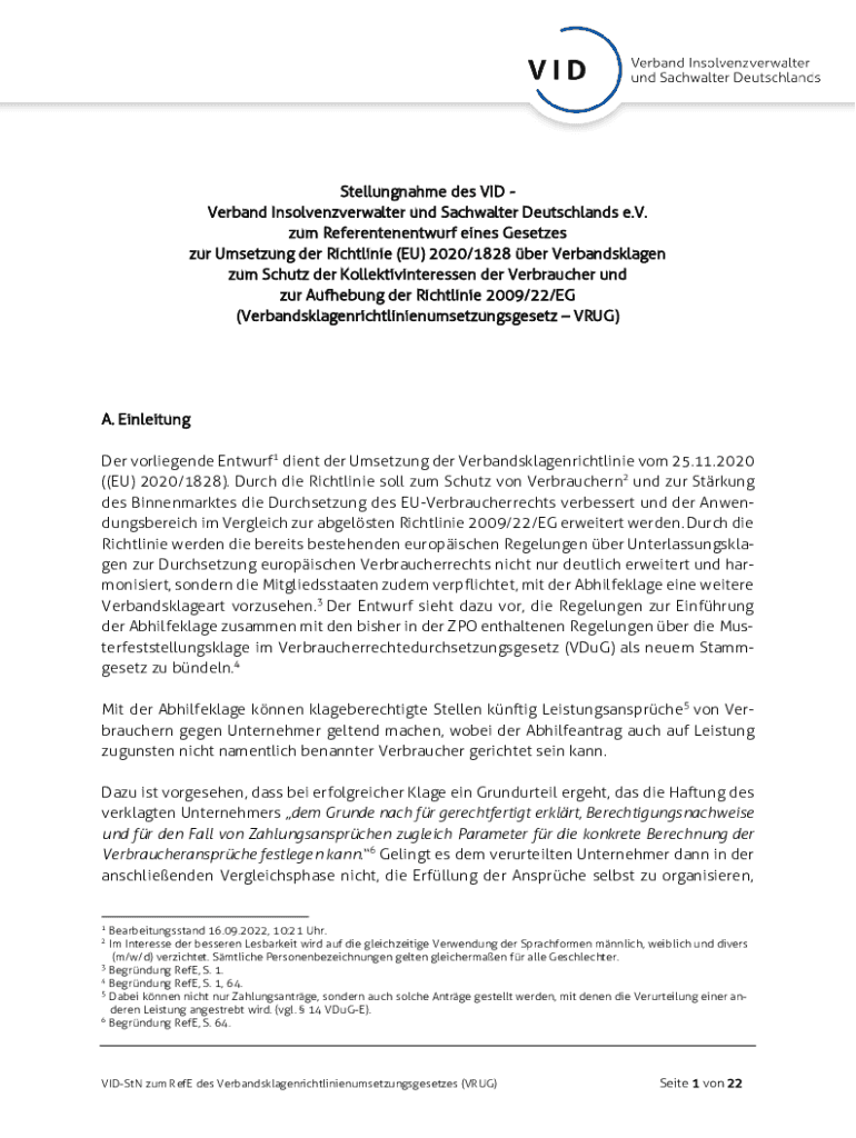 Stellungnahme des VID Verband Insolvenzverwalter und Sachwalter Deutschlands e.V. zum Referentenentwurf eines Gesetzes zur Umsetzung der Richtlinie (EU) 2020/1828 ber Verbandsklagen zum Schutz der