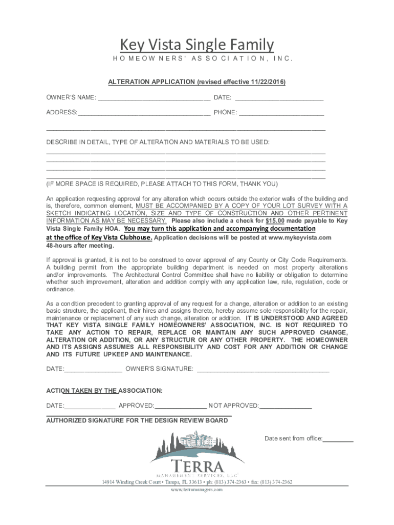 Key Vista Single FamilyHO MEOW NERS AS SO CI AT IO N, INC. ALTERATION APPLICATION (revised effective 11/22/2016) OWNERS NAME: ___ DATE: ___ ADDRESS:___ PHONE: ___ ___ DESCRIBE IN DETAIL, TYPE OF ALTERATION