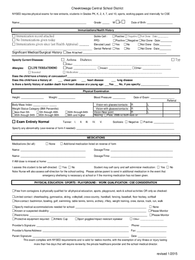 NYSED requires physical exams for new entrants, students in Grades PK, K, 2, 4, 7, and 10, sports, working papers and triennially for CSE