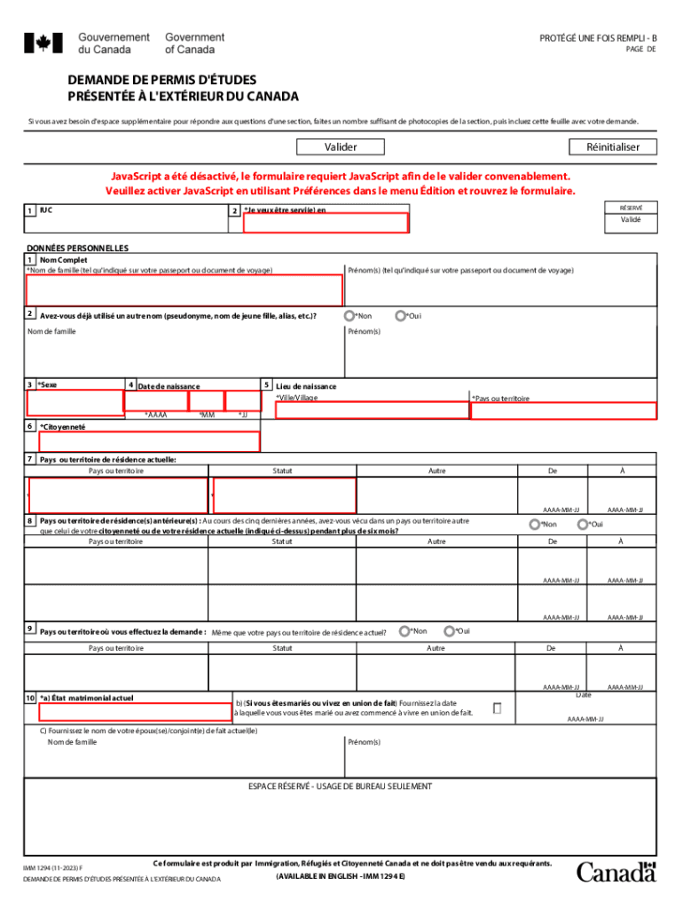 IMM 1294 F is an application form used by individuals applying for a study permit in Canada to study at designated learning institutions.