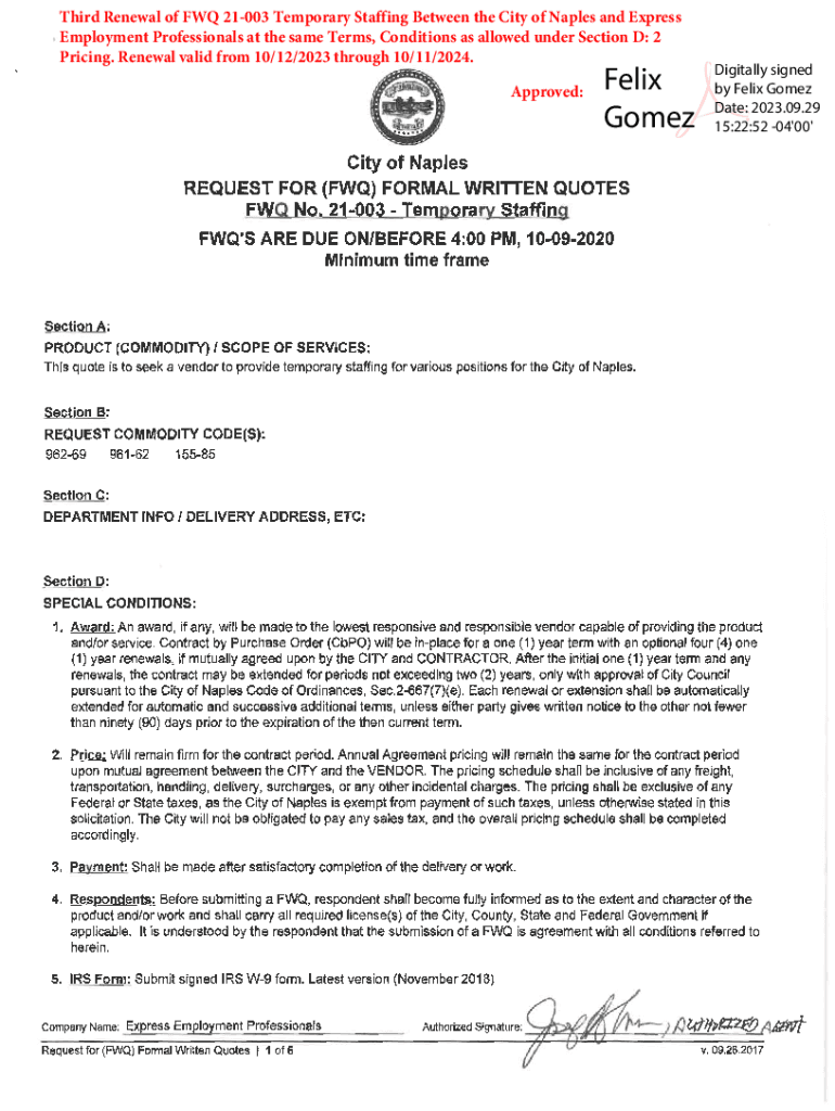 Third Renewal of FWQ 21003 Temporary Staffing Between the City of Naples and Express Employment Professionals at the same Terms, Conditions as allowed under Section D: 2 Pricing. Renewal valid from