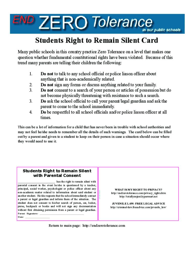 Students Right to Remain Silent Card Many public schools in this country practice Zero Tolerance on a level that makes one question whether fundamental constitutional rights have been violated. Because