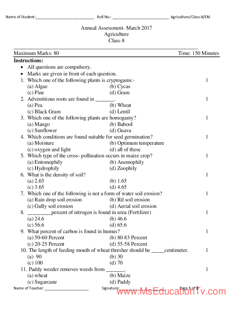Name of Student:___ Roll No.: ___ Agriculture/Class8/EMAnnual Assessment March 2017 Agriculture Class8 ___ Maximum Marks: 80 Time: 150 Minutes Instructions: All questions are compulsory. Marks are