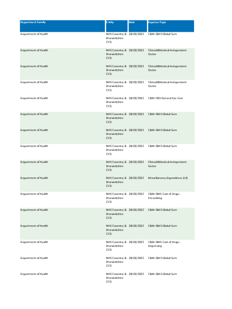 Department FamilyEntityDateExpense TypeDepartment of Health NHS Coventry & 28/02/2022