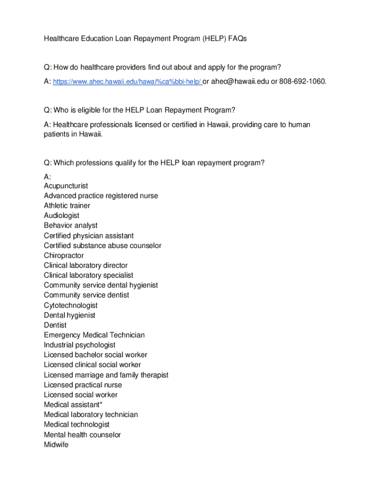 Healthcare Education Loan Repayment Program (HELP) FAQs: How do healthcare providers find out about and apply for the program? A: https://www.ahec.hawaii.edu/hawai%ca%bbihelp/ or ahec@hawaii.edu or